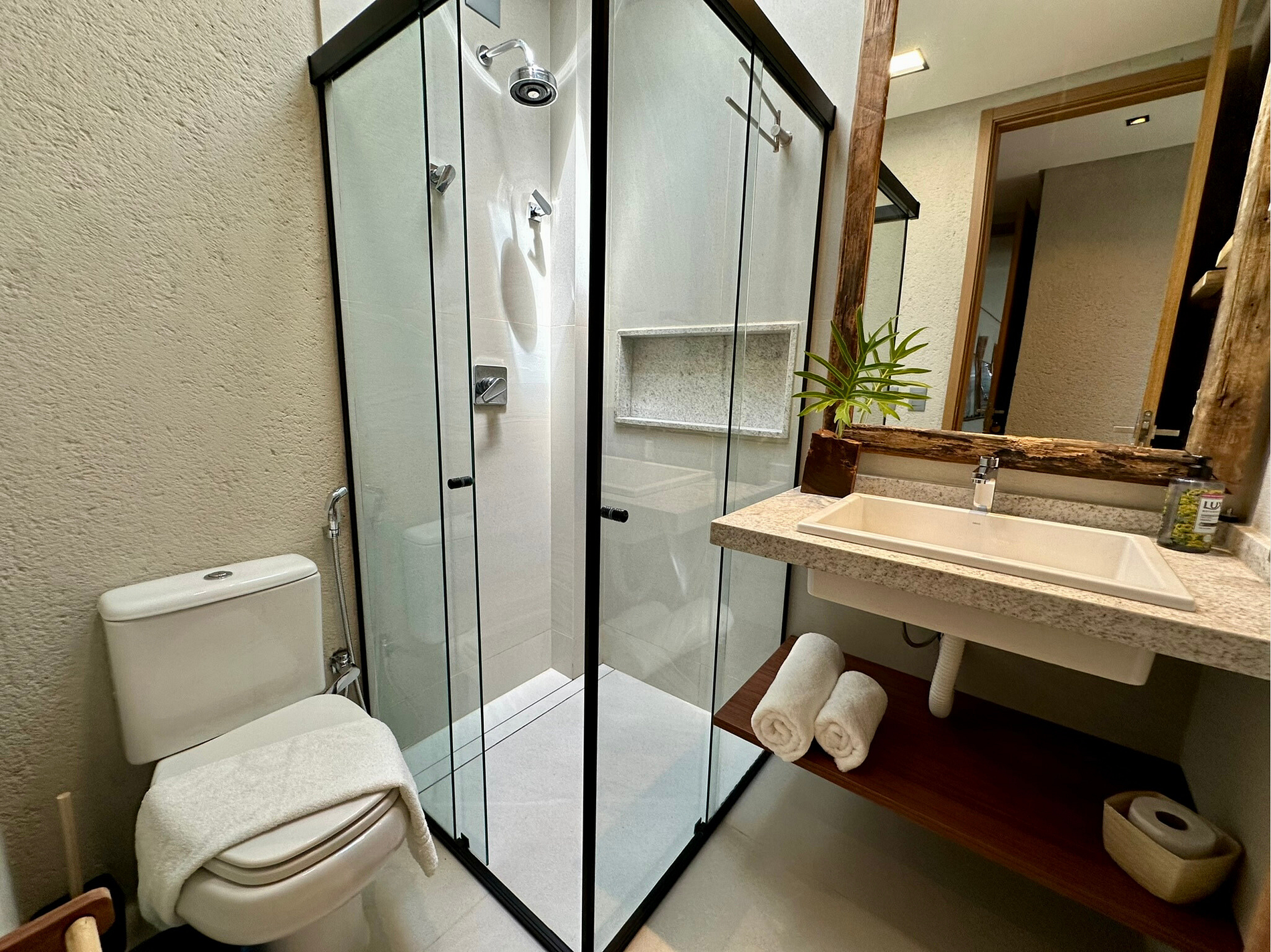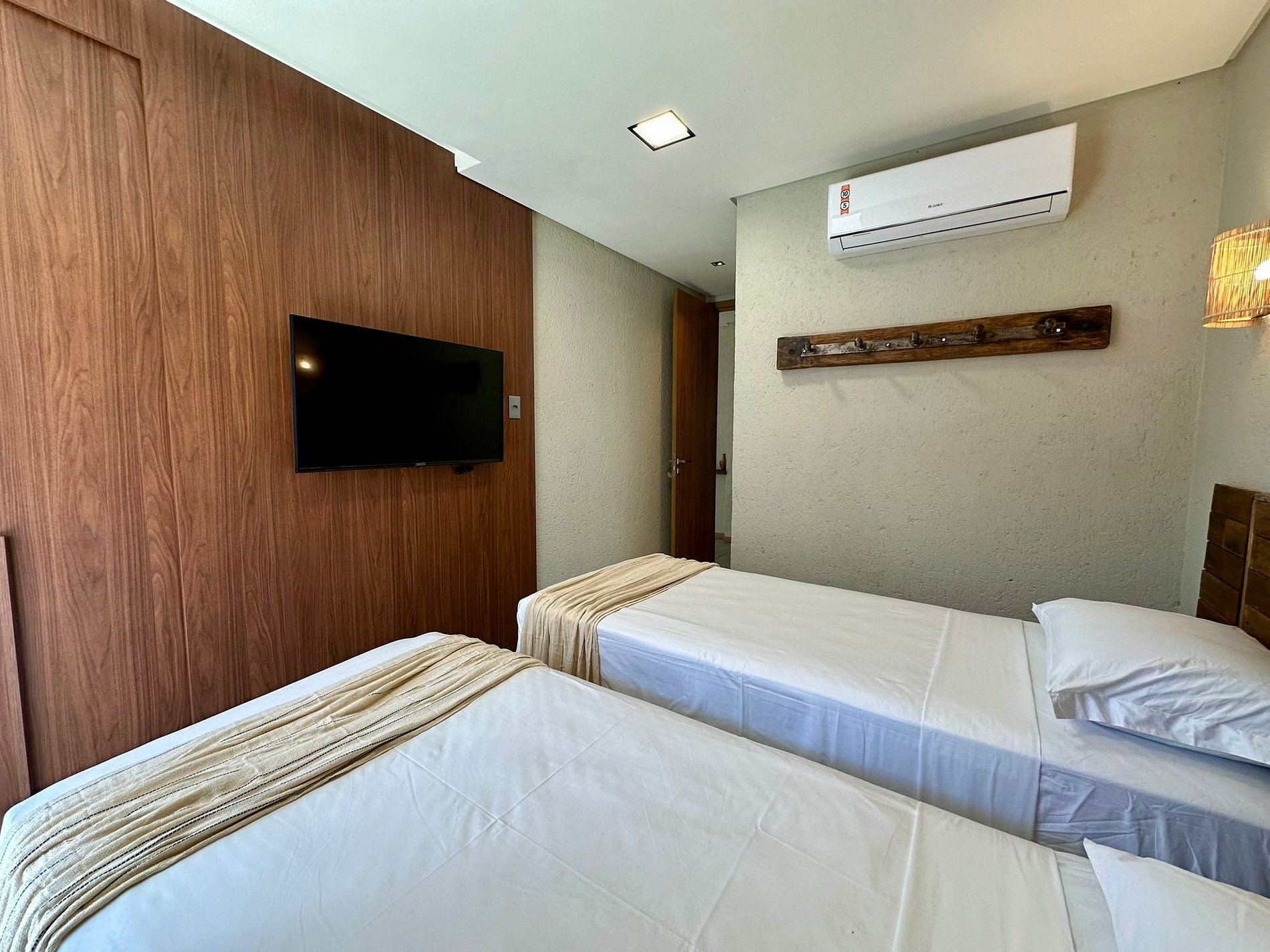 Com 5 suítes confortáveis, a casa pode acomodar até 12 hóspedes, distribuídas entre 4 suítes no primeiro andar e 1 no térreo, todas com ar condicionado e TV.
