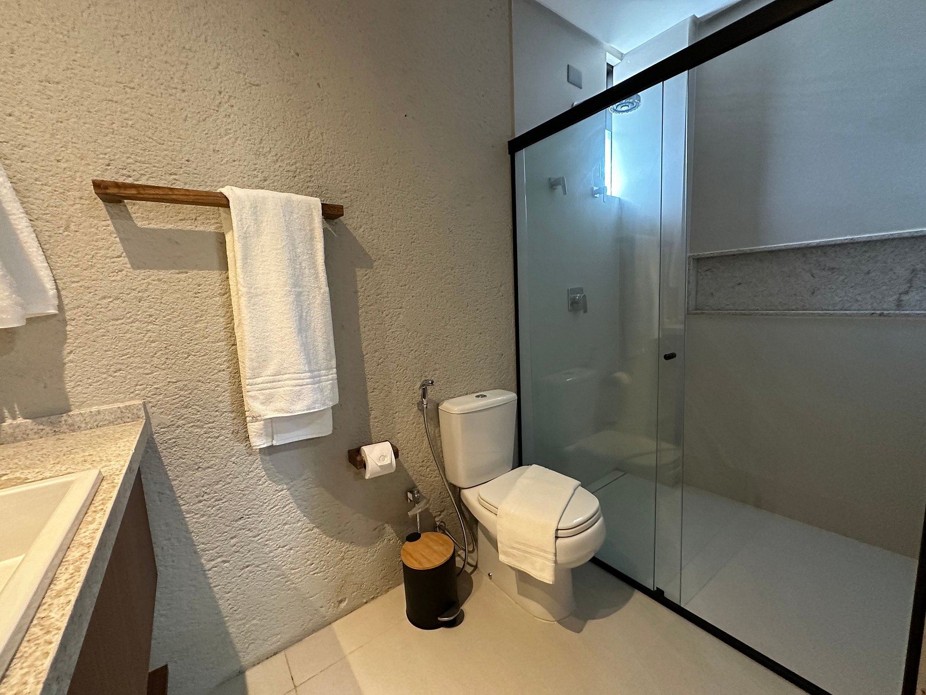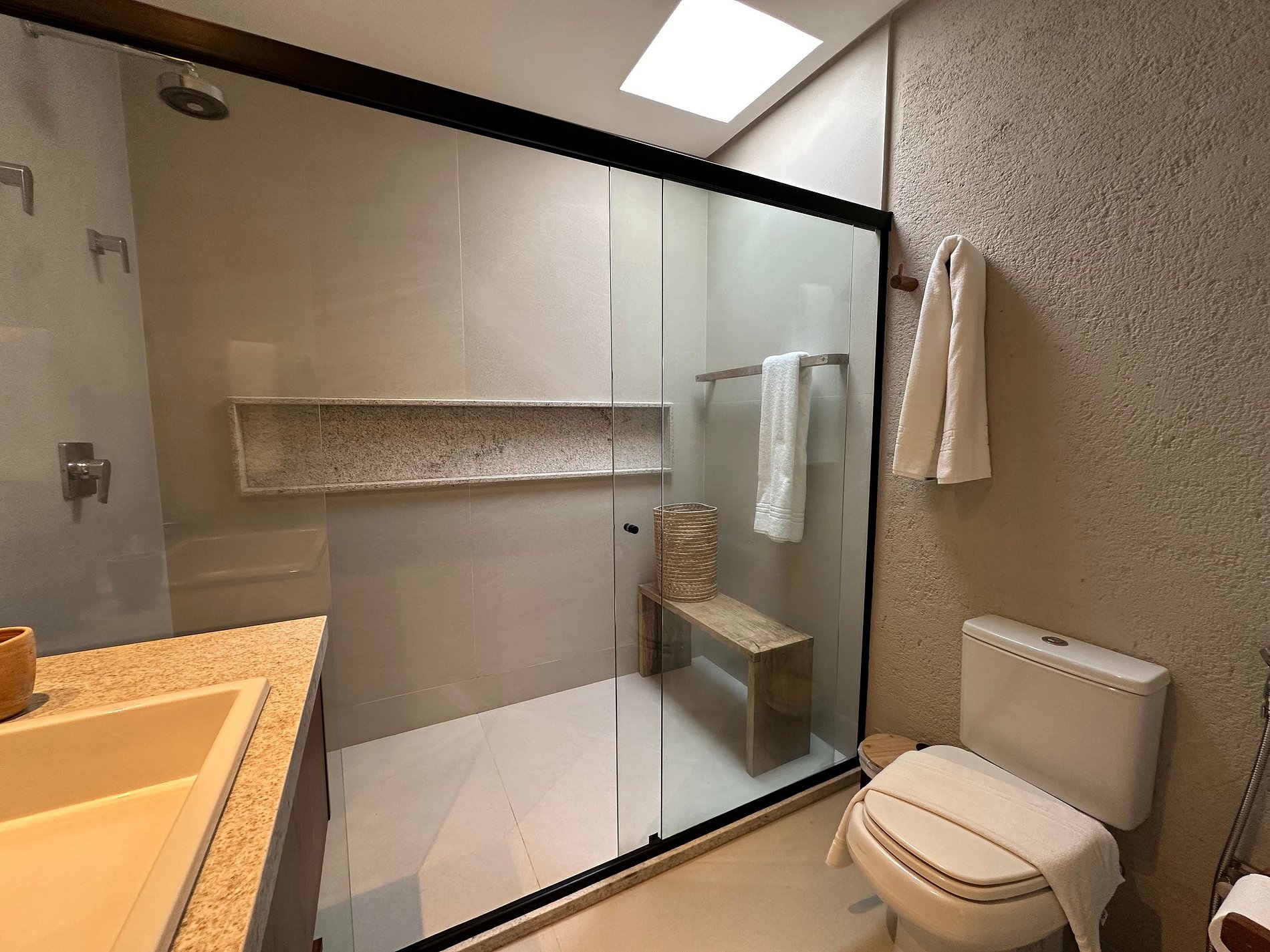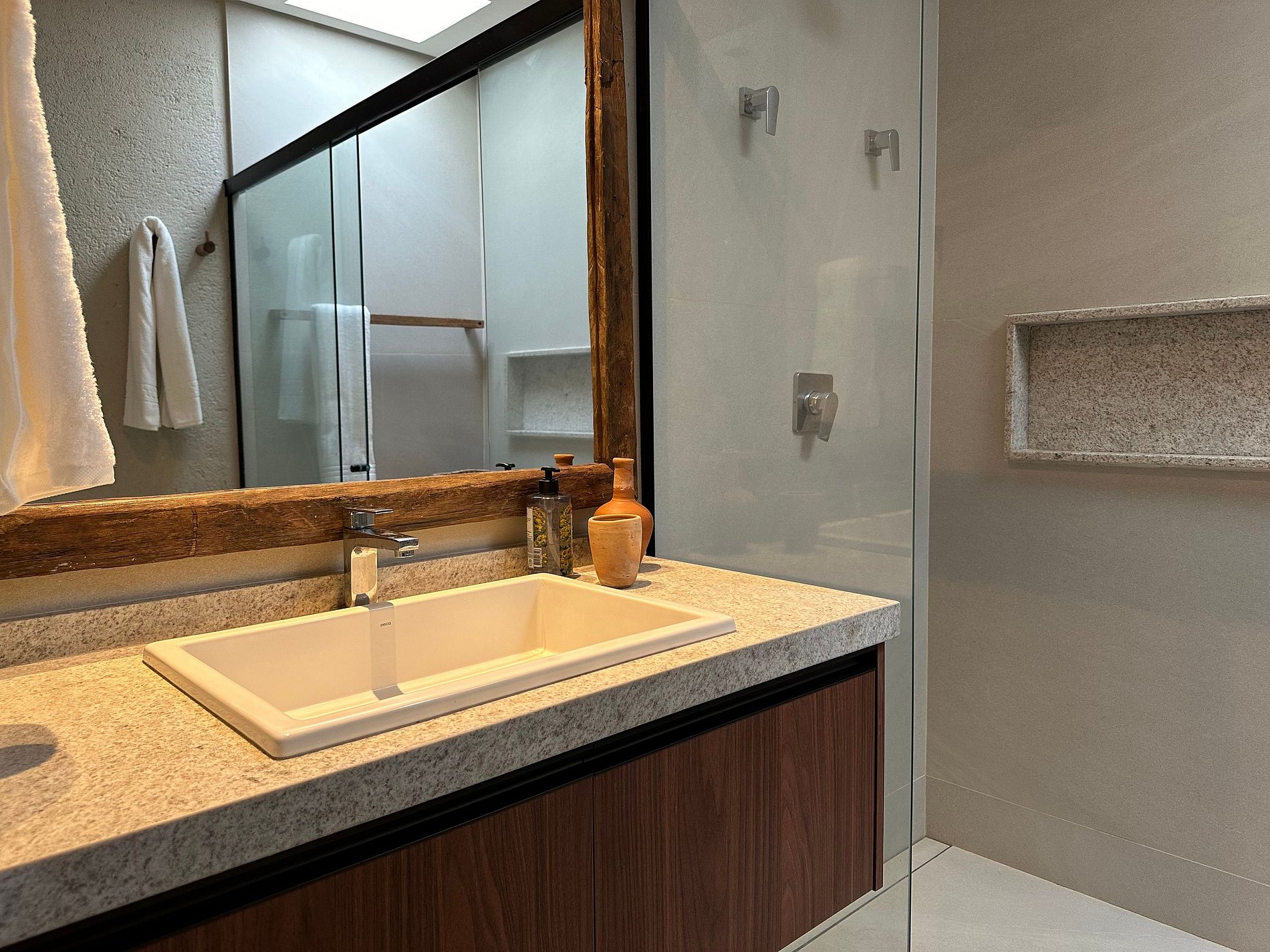Com 5 suítes confortáveis, a casa pode acomodar até 12 hóspedes, distribuídas entre 4 suítes no primeiro andar e 1 no térreo, todas com ar condicionado e TV.