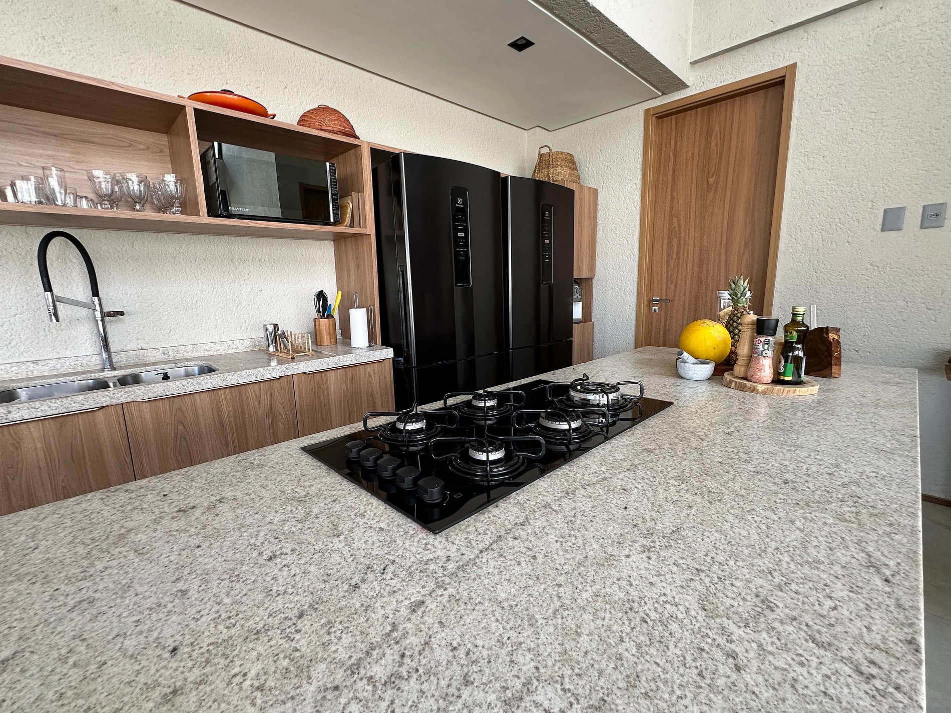 A sala de estar se integra harmoniosamente a uma cozinha em ilha, completamente equipada. A varanda gourmet é o local ideal para momentos de lazer, com uma piscina convidativa, área de estar com sofá e churrasqueira.
