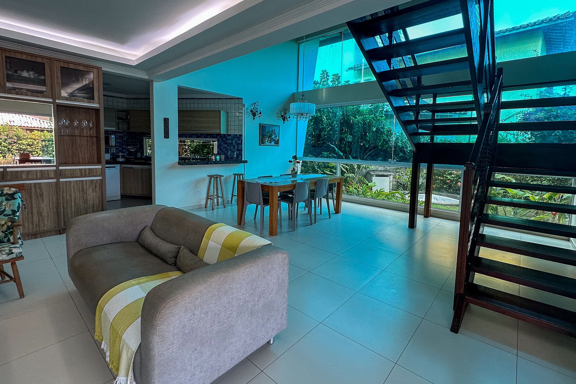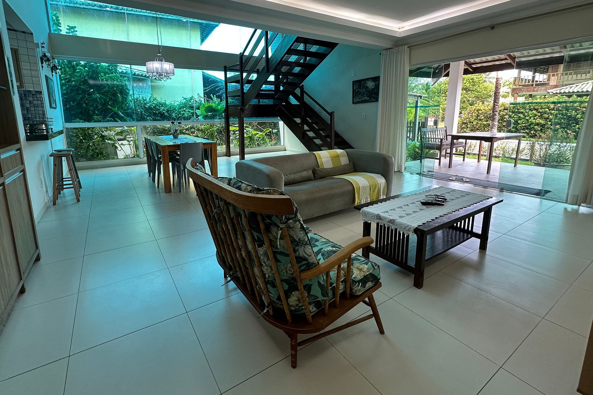 No térreo, encontram-se duas suítes climatizadas, uma sala de estar aconchegante com lavabo, uma sala de jantar e uma cozinha totalmente equipada com utensílios, geladeira, forno, máquina de lavar louças e um freezer na área externa. Além disso, este andar foi projetado para acessibilidade, contando com rampas para facilitar o acesso de cadeirantes.