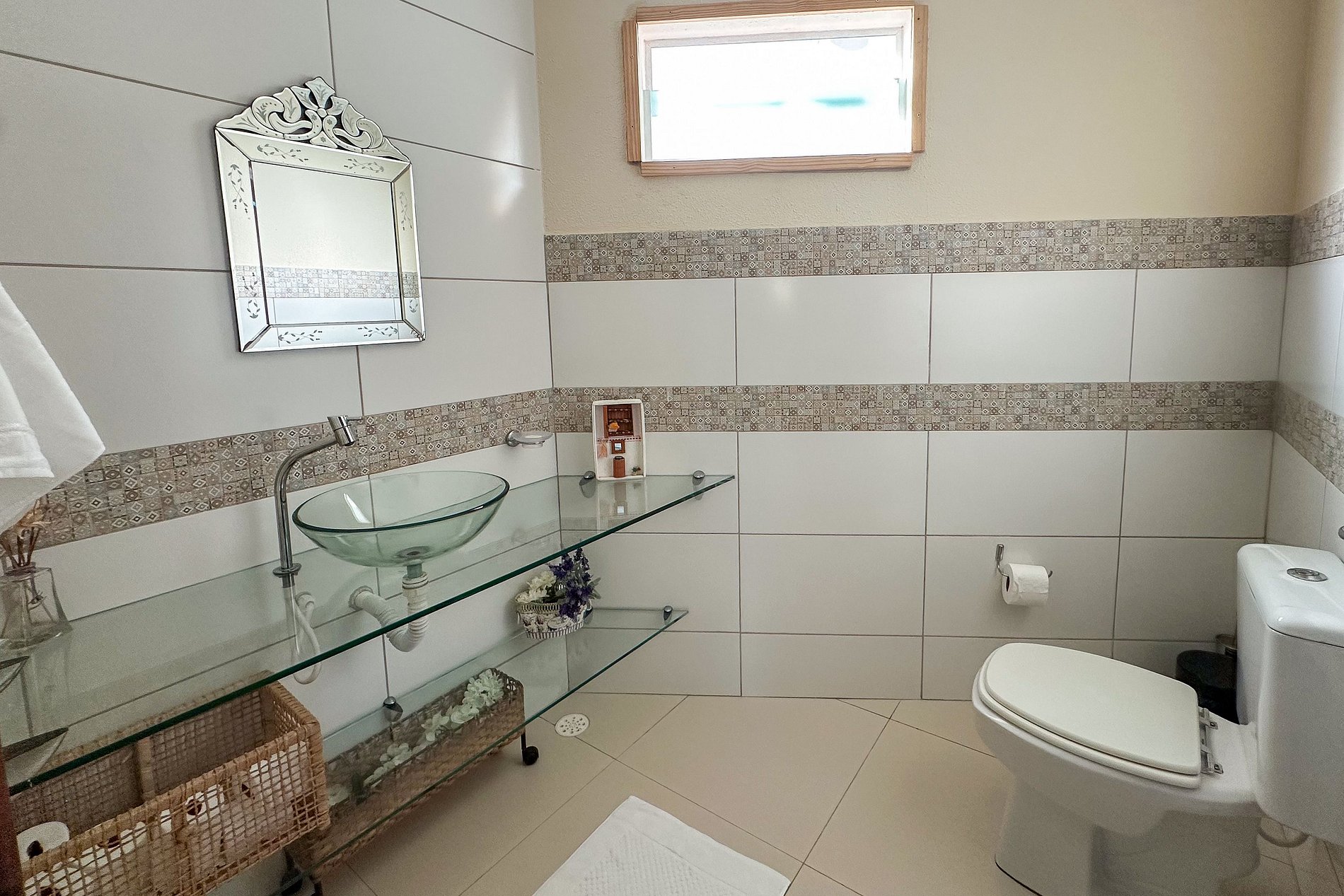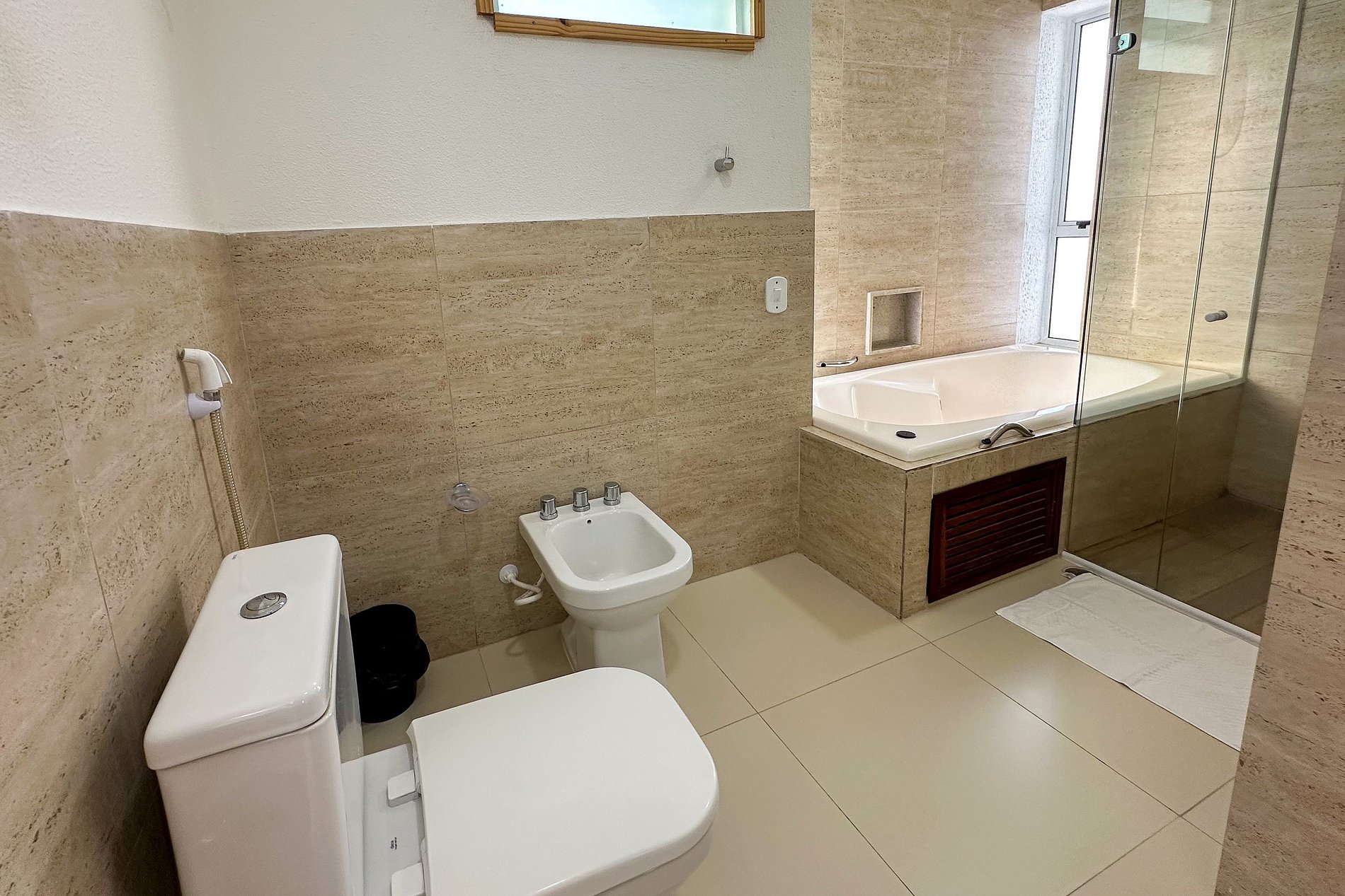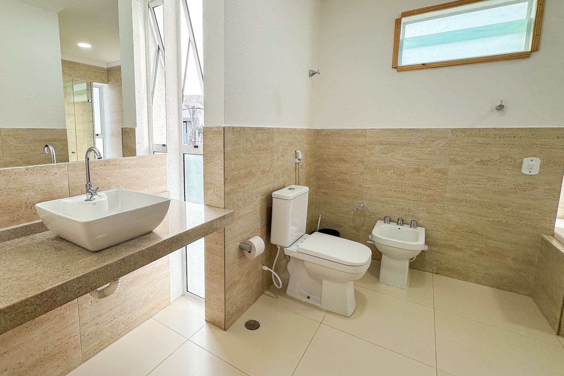 No andar superior, há uma ante-sala com varanda e mais duas suítes climatizadas, sendo uma delas equipada com um banheiro espaçoso, com banheira e chuveiro.