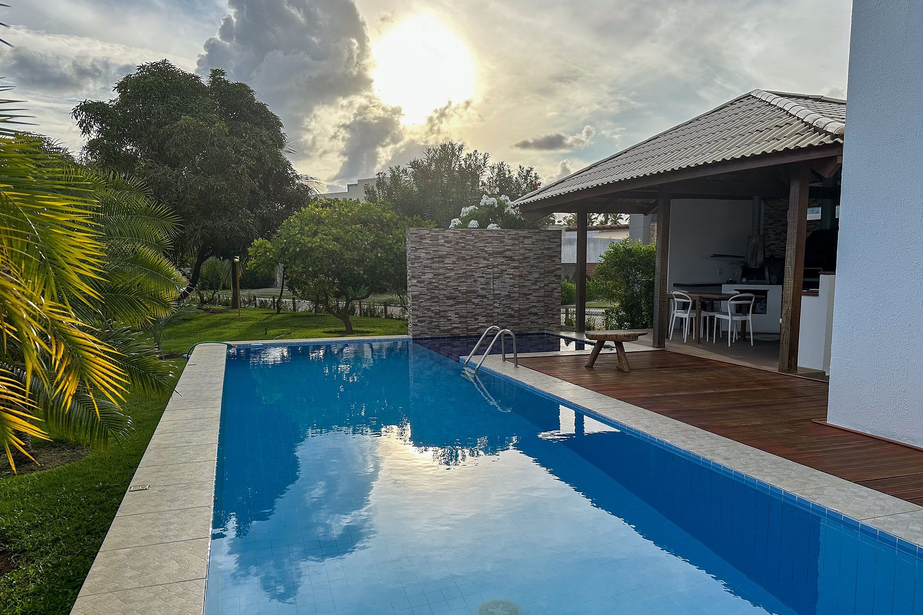 A área externa conta com um jardim arborizado, uma piscina com cascata e um espaço coberto com churrasqueira e forno de pizza.