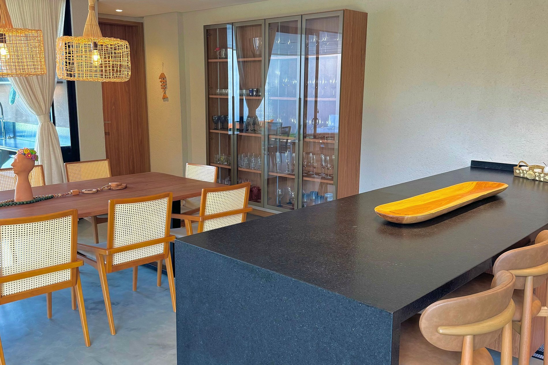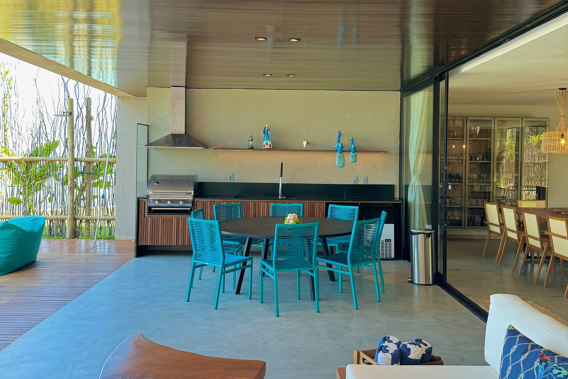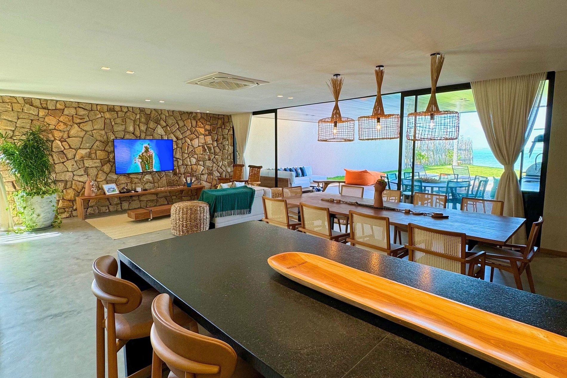 No térreo, a cozinha completa se conecta à sala de jantar e à sala de TV, formando um ambiente aconchegante e funcional. Esses espaços se abrem para uma ampla varanda com piscina, gramado e uma vista espetacular da Praia de Marceneiro. O local é ideal para momentos de lazer e churrascos, equipado com sofá, puffs, espreguiçadeiras, churrasqueira a gás e uma mesa para reunir todos da casa.