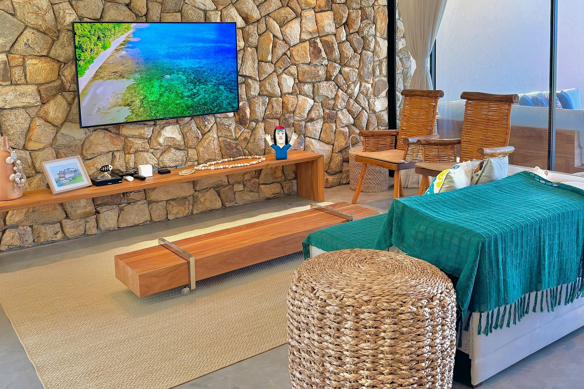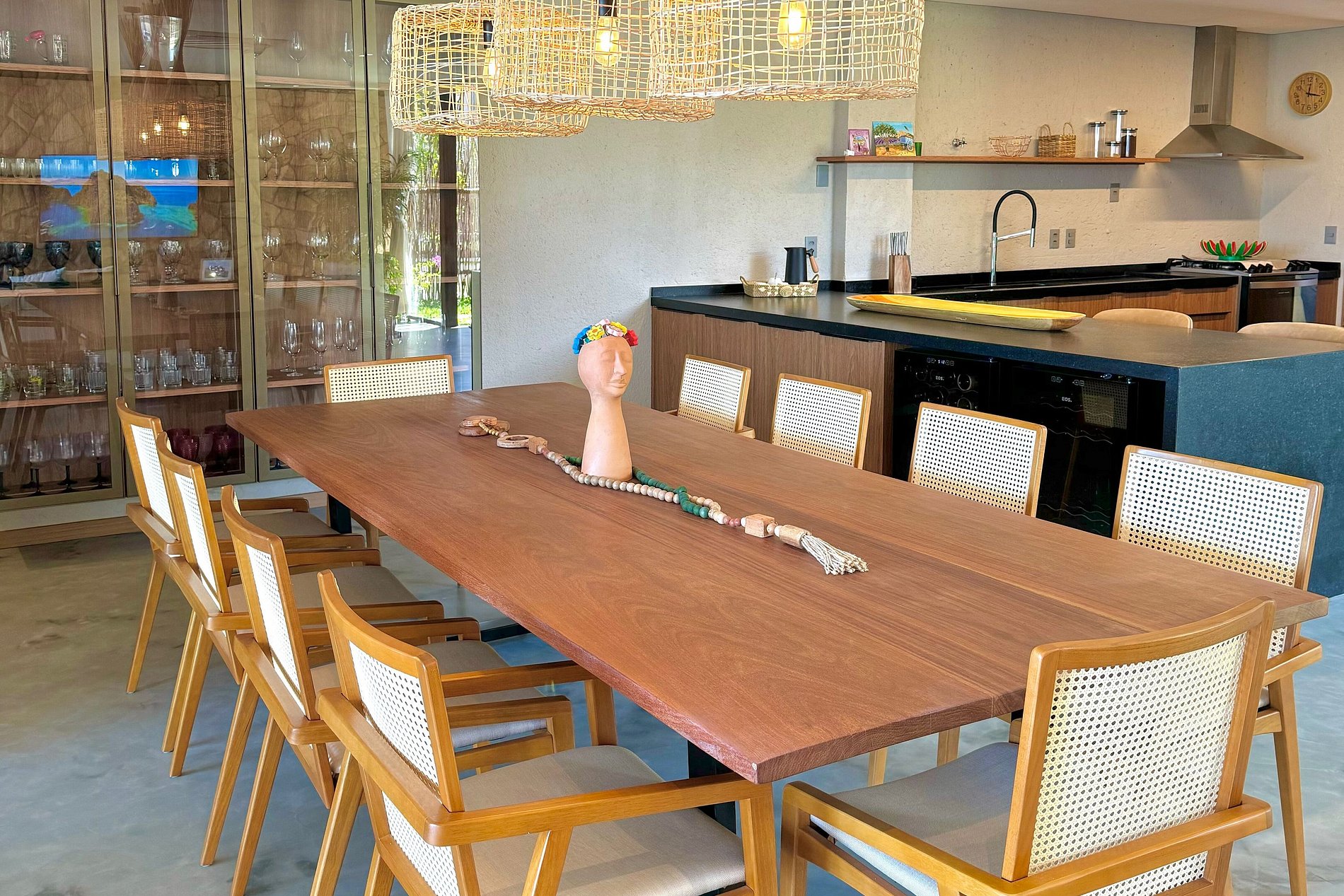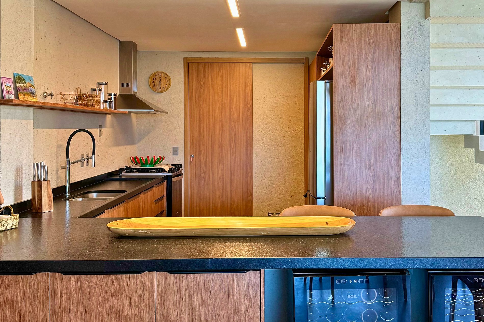 No térreo, a cozinha completa se conecta à sala de jantar e à sala de TV, formando um ambiente aconchegante e funcional. Esses espaços se abrem para uma ampla varanda com piscina, gramado e uma vista espetacular da Praia de Marceneiro. O local é ideal para momentos de lazer e churrascos, equipado com sofá, puffs, espreguiçadeiras, churrasqueira a gás e uma mesa para reunir todos da casa.