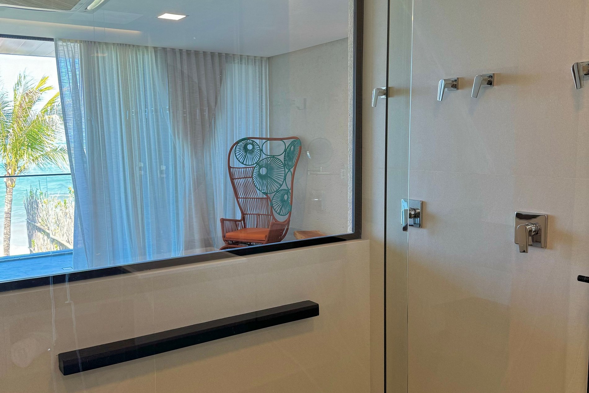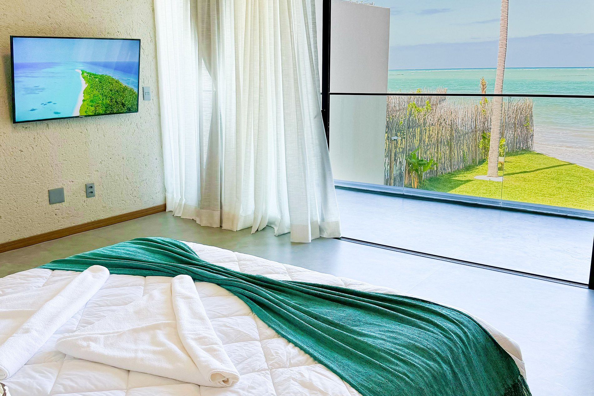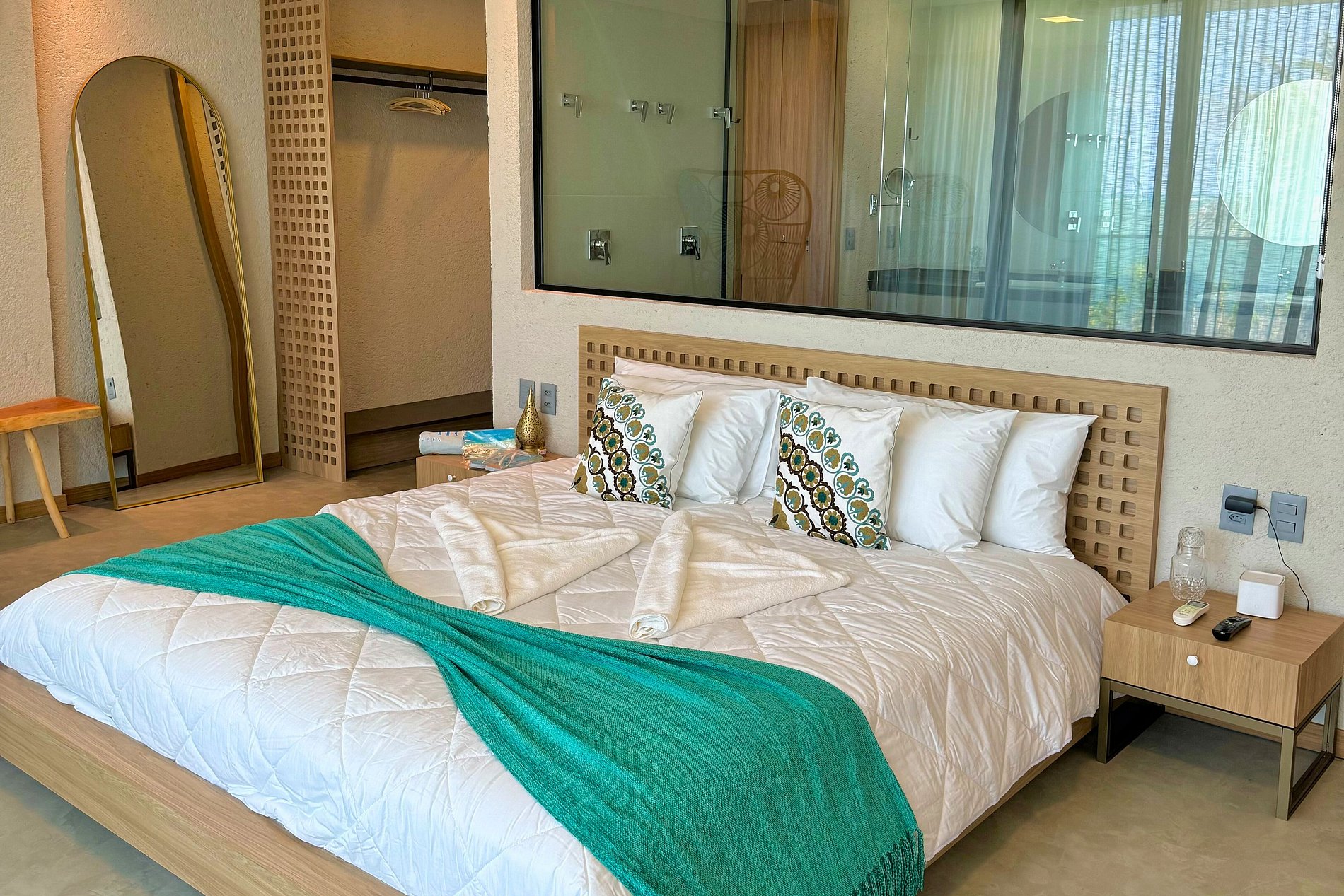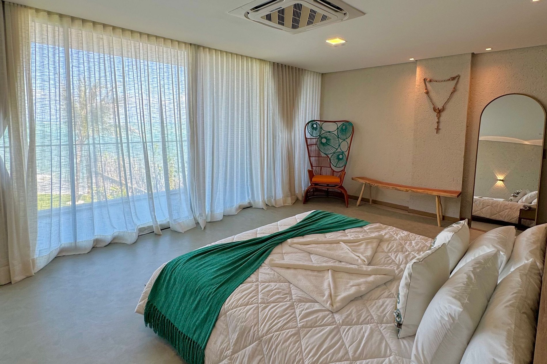 A casa conta com 5 suítes climatizadas, sendo uma no térreo e quatro no primeiro andar. A suíte especial tem um espaço perfeito para fotos, uma vista deslumbrante para o mar e um banheiro projetado para que a paisagem seja apreciada até mesmo durante o banho.