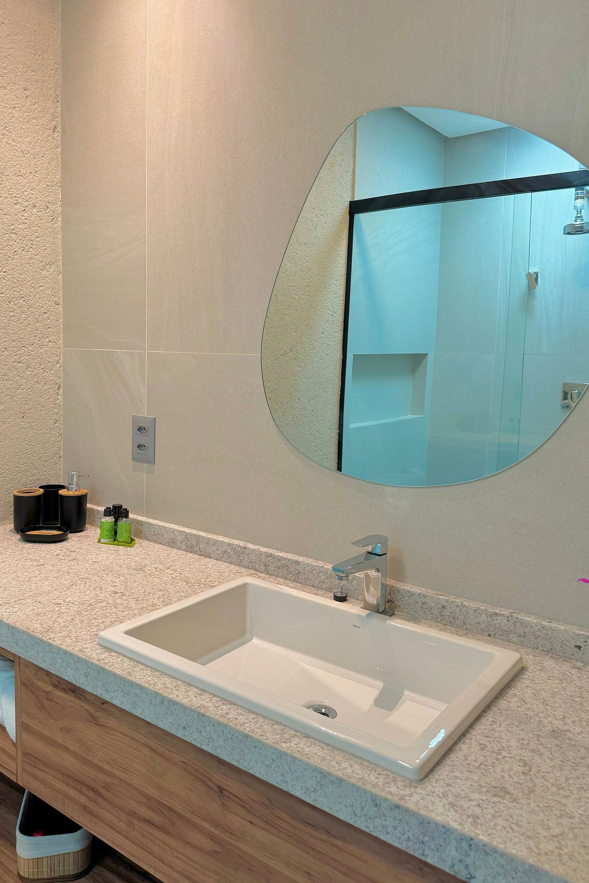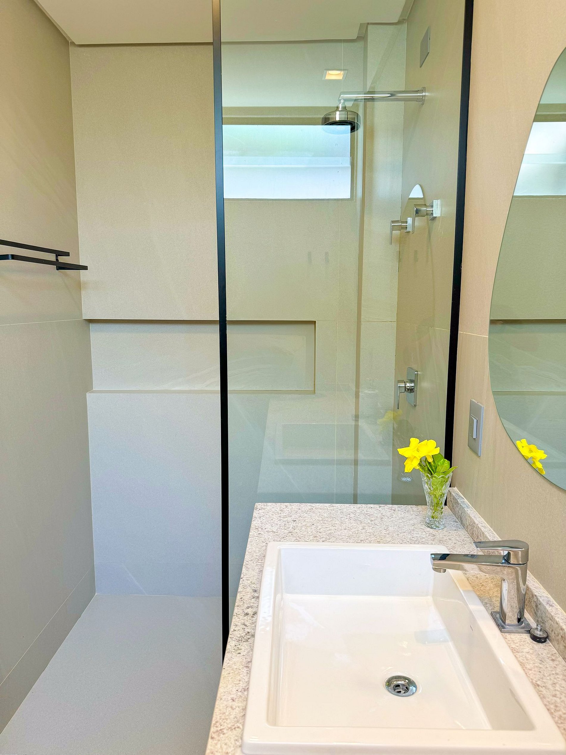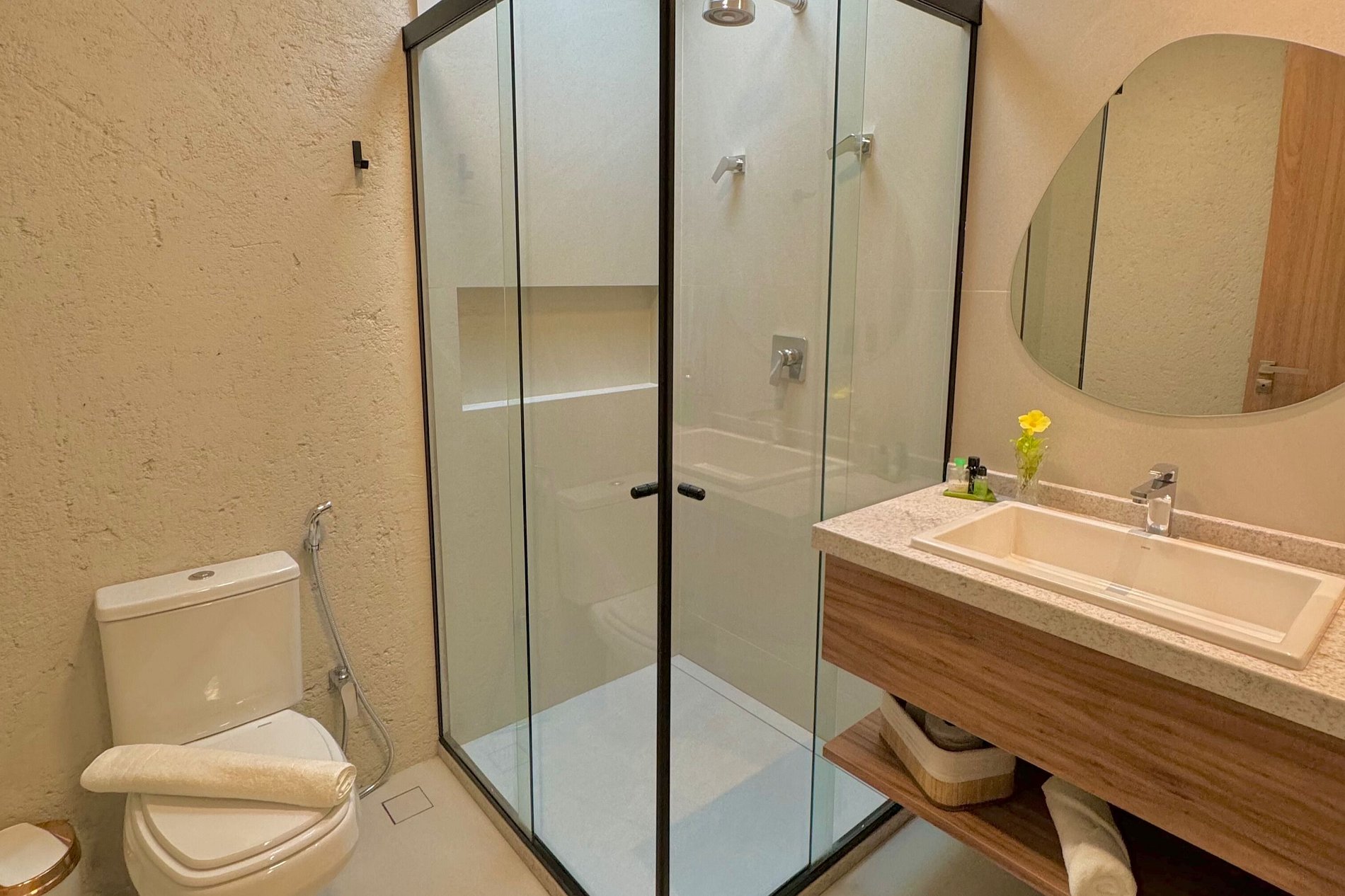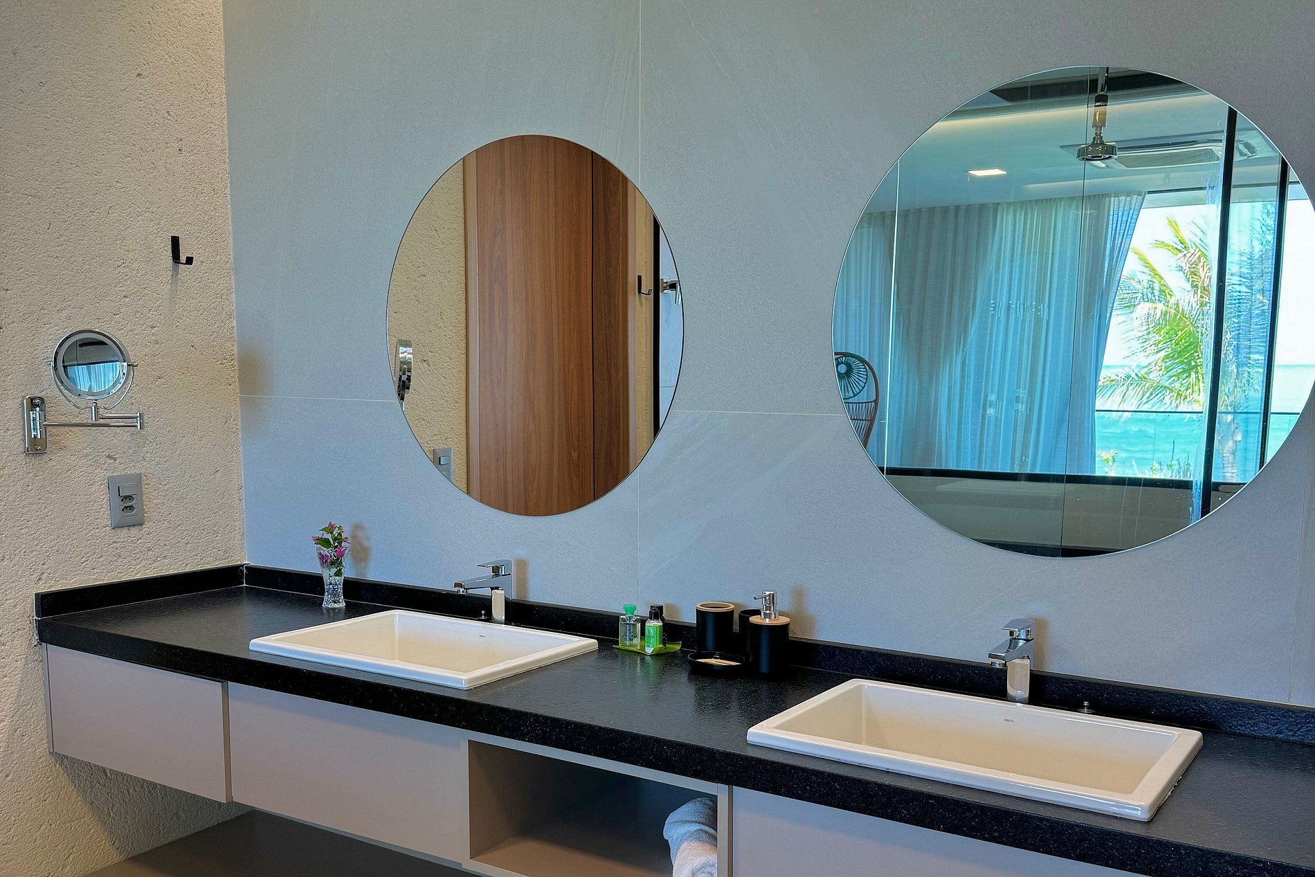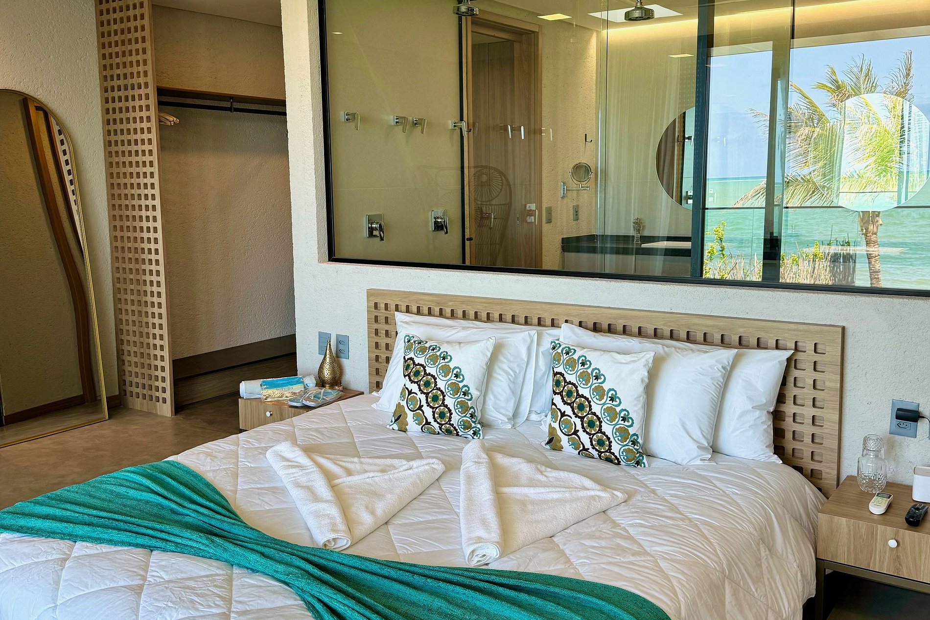 A casa conta com 5 suítes climatizadas, sendo uma no térreo e quatro no primeiro andar. A suíte especial tem um espaço perfeito para fotos, uma vista deslumbrante para o mar e um banheiro projetado para que a paisagem seja apreciada até mesmo durante o banho.
